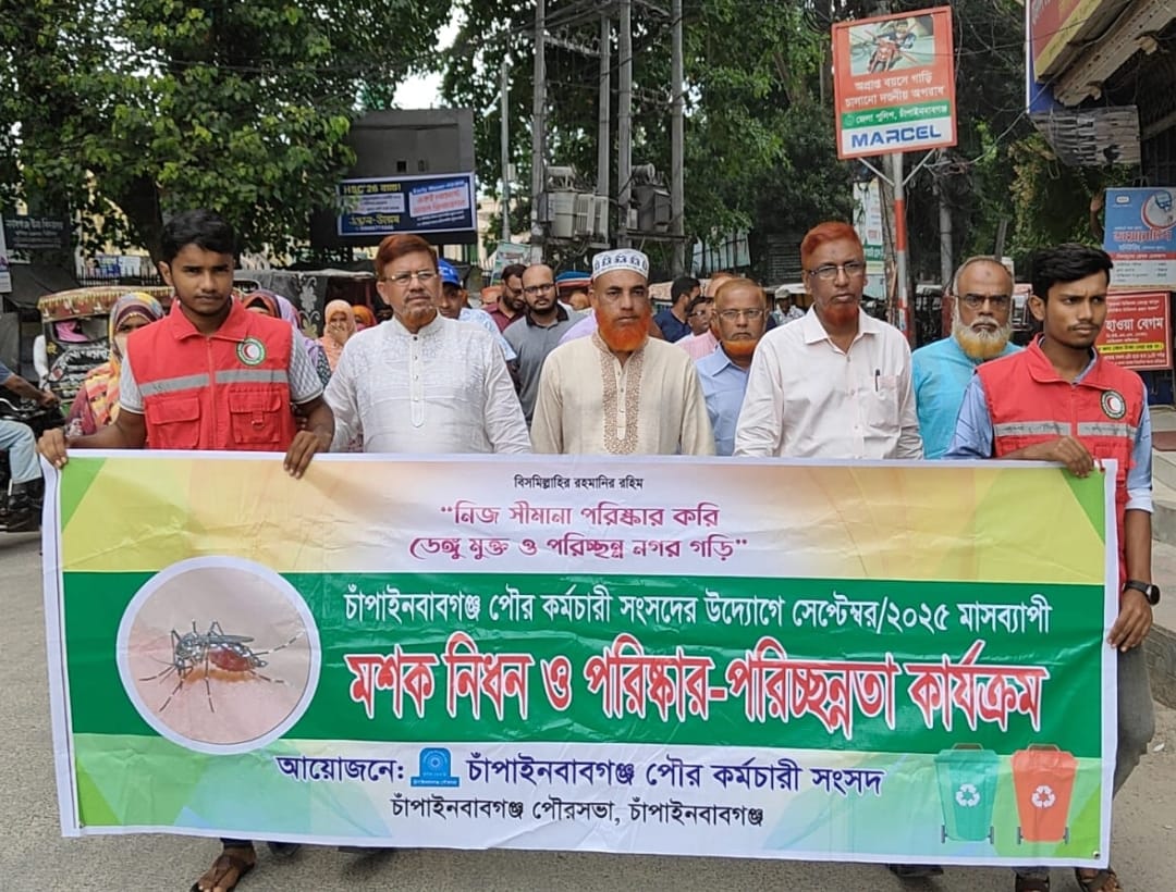 চাঁপাইনবাবগঞ্জ পৌরসভায় পৌর কর্মচারী সংসদের উদ্যোগে ২৩ই সেপ্টেম্বর রোজ মঙ্গলবার সকাল ১১ ঘটিকায় পৌর চত্তর থেকে মশক নিধন ও পরিষ্কার-পরিচ্ছন্নতা কার্যক্রম বাস্তবায়নে পৌরসভার প্রধান প্রধান সড়কে র্যালি ও লিফলেট বিতরণ করেন। চাঁপাইনবাবগঞ্জ পৌরসভার এই মহৎ কার্যক্রম উদ্বোধন করেন চাঁপাইনবাবগঞ্জ পৌরসভার নির্বাহী প্রকৌশলী মোঃ তৌফিকুল ইসলাম। উক্ত র্যালিতে "নিজ সীমানা পরিষ্কার করি,ডেঙ্গু মুক্ত ও পরিচ্ছন্ন নগর গড়ি" স্লোগানের মধ্য দিয়ে আশেপাশে সকল জনগণের হাতে লিফলেট তুলে দেন পৌর কর্মচারী সংসদ। চাঁপাইনবাবগঞ্জ পৌরসভার পৌর কর্মচারী সংসদ। এসময় উপস্থিত ছিলেন চাঁপাইনবাবগঞ্জ পৌরসভার পৌর কর্মচারী সংসদের সভাপতি এনামুল হক, সিনিয়র সভাপতি রবিউল আউয়াল ,চাঁপাইনবাবগঞ্জ পৌরসভার নির্বাহী প্রকৌশলী তৌফিকুর ইসলাম । চাঁপাইনবাবগঞ্জ পৌরসভার পৌর কর্মচারী সংসদের পক্ষ থেকে মাসব্যাপী পরিষ্কার- পরিচ্ছন্নতা ও বর্জ্য অপসারণ কাজ সহ ডেঙ্গু নিধন কার্যক্রম (ক্রাস প্রোগাম) শুরু হয়েছে। আমাদের সকলের দায়িত্ব পৌরসভাকে সুন্দর রাখা এবং স্বাস্থ্যকর পরিবেশ বজায় রাখা। চাঁপাইনবাবগঞ্জ পৌরবাসীর কাছে সহযোগিতা চেয়েছেন।চাঁপাইনবাবগঞ্জ পৌরসভার পৌর কর্মচারী সংসদের সাধারণ সম্পাদক আব্দুল আজিজ খান, চাঁপাইনবাবগঞ্জ পৌরসভার পৌর নির্বাহী কর্মকর্তা মামুন- অর- রশীদ,চাঁপাইনবাবগঞ্জ পৌরসভা হিসাব রক্ষক কর্মকর্তা মোঃ আহসান হাবিব,চাঁপাইনবাবগঞ্জ পৌরসভা সেনেটারী ইন্সপেক্টর মোঃ গোলাম ফারুক চাঁপাইনবাবগঞ্জ পৌরসভার কনজারবেন্সী ইন্সপেক্টর মোঃ রোজিবুল হক উপস্থিত ছিলেন সকল চাঁপাইনবাবগঞ্জ পৌর- কর্মচারী সংসদ সহ প্রিন্ট ও ইলেকট্রনিক মিডিয়ার সাংবাদিক বিন্দু । আনুষ্ঠিক ভাবে এই মাসব্যাপী মশক নিধন ও পরিষ্কার পরিচ্ছন্ন কার্যক্রম সমাপ্তি ঘোষনা করা হলো নিয়মিত কার্যক্রম চলমান থাকবে।