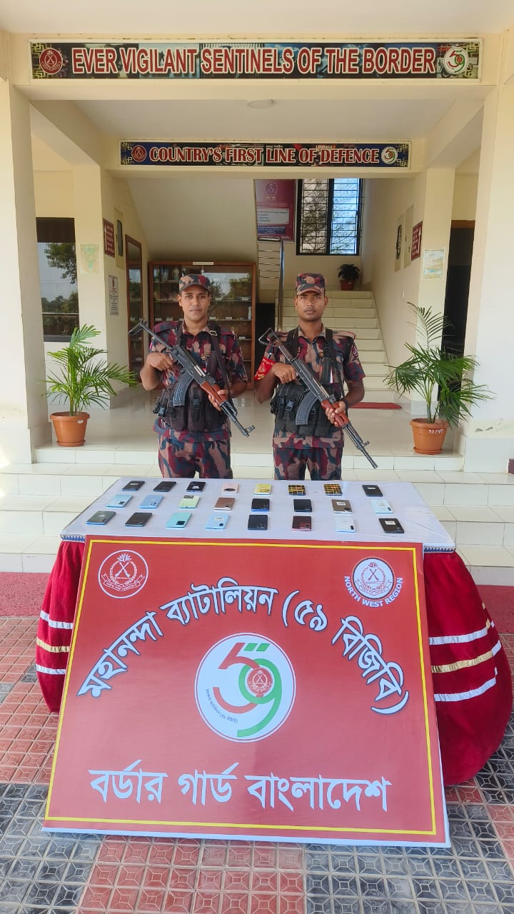 গত বৃহস্পতিবার ২৫ সেপ্টেম্বর আনুমানিক দুপুর ২টা ৩০ মিনিটে পাইনবাবগঞ্জ জেলার শিবগঞ্জ উপজেলাধীন কানসাট পল্লী বিদুৎ মোড় এলাকায় মহানন্দা ব্যাটালিয়নের (৫৯ বিজিবি) একটি বিশেষ টহল দল সুনির্দিষ্ট গোয়েন্দা তথ্যের ভিত্তিতে সোনামসজিদ-শিবগঞ্জ সড়কে অবস্থান নেয়। কিছুক্ষণ পর টহল দল একটি মোটরসাইকেলযোগে ০২ জন ব্যক্তিকে আসতে দেখতে পায়। তাৎক্ষণিক টহল দল মোটরসাইকেলটিকে থামানোর সংকেত দিলে চালক গাড়ির গতি হালকা কমিয়ে থামানোর ভান করে। টহল সদস্যরা মোটরসাইকেল আরোহীর সাথে কথোপকথনের জন্য তার নিকটবর্তী হলে চালক সুযোগ বুঝে মোটরসাইকেল টান দেয়। তাৎক্ষণিক টহল কমান্ডার মোটরসাইকেল এর পেছনের যাত্রীর ব্যাগটি ধরে তাদের থামানোর চেষ্টা করলে ব্যাগটি কাঁধ থেকে ফেলে দিয়ে তারা পালিয়ে যায়। পরবর্তীতে ফেলে যাওয়া ব্যাগ সন্দেহজনক মনে হলে টহলদল তা তল্লাশী করে ২৪ টি ভারতীয় চোরাই মোবাইল ফোন দেখতে পায়। উল্লিখিত চোরাই মোবাইলগুলো পরবর্তী আইনি পদক্ষেপের জন্য শিবগঞ্জ থানায় জমা দেয়ার কার্যক্রম প্রক্রিয়াধীন।