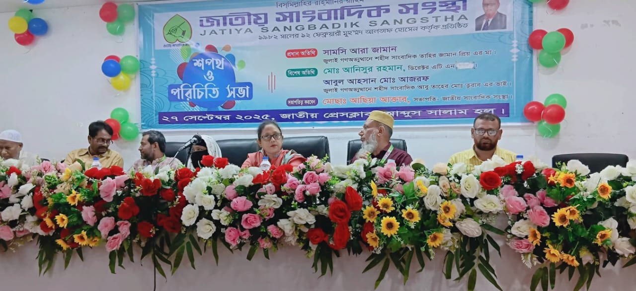 প্রয়াত সাংবাদিক নেতা মুহম্মদ আলতাফ হোসেন প্রতিষ্ঠিত, দক্ষিণ এশিয়ার বৃহৎতম সাংবাদিক সংগঠন জাতীয় সাংবাদিক সংস্থা'র (২০২৫-২০২৮) ৩ বছর মেয়াদের নবনির্বাচিত কেন্দ্রীয় নির্বাহী পরিষদের শপথ গ্রহণ ও পরিচিতি সভা শনিবার সকালে রাজধানীর জাতীয় প্রেসক্লাবের আব্দুস সালাম মিলনায়তনে অনুষ্ঠিত হয়।