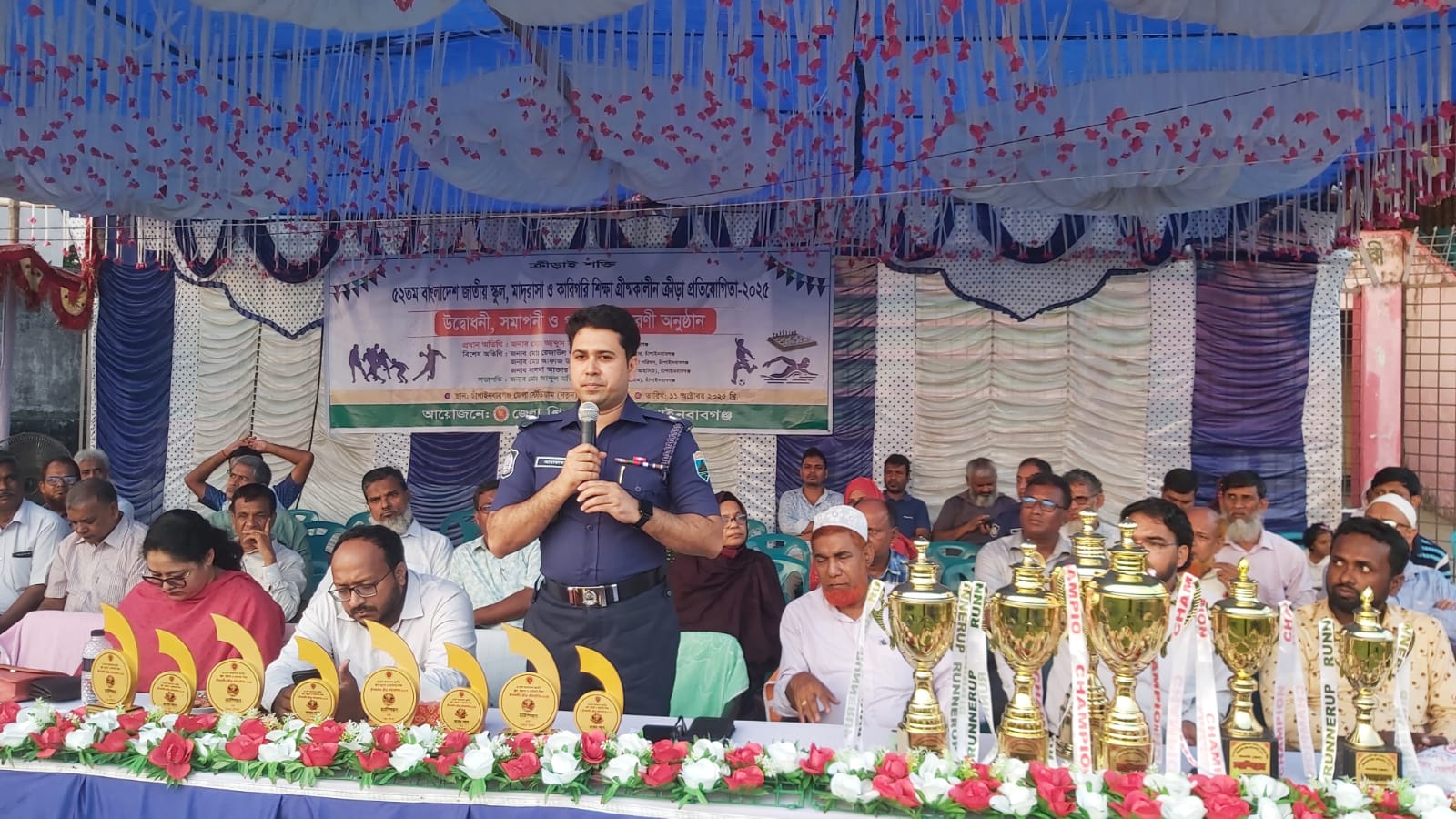 জেলা শিক্ষা অফিসার (ভারপ্রাপ্ত) মোঃ আব্দুল মতিনের সভাপতিত্বে অনুষ্ঠানে জেলার ৫টি উপজেলার বিজয়ী শিক্ষার্থী ও বিভিন্ন দলের হাতে ক্রিকেট, ফুটবল, ভলিবলসহ নানা ইভেন্টের ট্রফি, মেডেল ও সনদপত্র তুলে দেওয়া হয়।