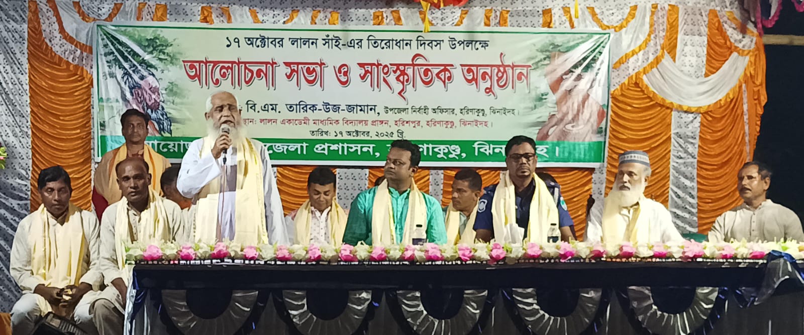 আজ ১৭ অক্টোবর (১ কার্তিক) বৃহস্পতিবার আধ্যাত্মিক সাধক বাউল সম্রাট লালন ফকিরের ১৩৫তম তিরোধান দিবস উপলক্ষে হরিনাকুন্ডু উপজেলা প্রশাসনের আয়োজনে ১দিনব্যাপী আলোচনা সভা ও সাংস্কৃতিক অনুষ্ঠান সহ লালন মেলার সামগ্রিক সহযোগীতায় হরিশপুর লালন একাডেমী পরিষদ হরিণাকুন্ডু ঝিনাইদহ। লালন মেলা উপলক্ষ্যে যেন হাজারো ভক্ত-অনুসারীদের পদচারণায় মুখর হয়ে উঠেছে হরিশপুর। সরেজমিন ঘুরে দেখাগেছে, ১৩৫ তম লালন তিরোধান দিবস উপলক্ষ্যে লালন একাডেমী মাধ্যমিক বিদ্যালয়ের বিশাল মাঠে (পশ্চিমে) শতাধিক বাউল ভক্ত-অনুসারীরা অস্থায়ী তাবু গেড়ে আস্তানা তৈরি করেছেন থাকার জন্য। আর এসব পৃথক পৃথক আস্তানার মধ্যে অবস্থান নেওয়া বাউল অনুসারীরা একতারা-দোতারা সহ নানা বাদ্যের তালে গেয়ে চলেছেন লালন শাহ্ রচিত বাউল গান। আর মাঠের দক্ষিণে তৈরি করা হয়েছে মঞ্চ এবং উত্তরে বসেছে শ্রোতা মন্ডলী ও নানা পণ্য সামগ্রীর দোকান । এ ছাড়াও ফকির লালন শাহ’র গুরু দরবেশ সিরাজ সাইজির সমাধির পাশের উন্মুক্ত সেডের নীচেও বসেছেন দূর-দূরান্ত থেকে আসা ভক্ত-অনুসারীরা। এখানেও তারা লালনের অমর বাণী গেয়ে চলেছেন আপন মনে। লালন তিরোধান উৎসবে আগত ভক্ত সাধু-গুরুদের দরাজ কণ্ঠের গান সহ পরস্পরের ভাব বিনিময়ের দৃশ্য দেখতে সেখানে ভিড় জমাচ্ছেন সাধারণ দর্শনার্থীরা। মূল আয়োজন উদ্বোধন হওয়ার আগেই লালন ভক্ত-অনুসারী আর দর্শনার্থীদের পদচারণায় মুখরিত ফকির লালন শাহ’র গুরু দরবেশ সিরাজ সাইজির মাজার সহ পুরো লালন একাডেমী মাধ্যমিক বিদ্যালয় মাঠ প্রাঙ্গণ।হরিশপুর গ্রামের স্থানীয় বাসিন্দারা জানান, লালন তিরোধান দিবস উপলক্ষে শুধু লালনের আখড়াবাড়িই নয়, হরিশপুরে ফকির লালন শাহ’র গুরু দরবেশ সিরাজ সাইজির মাজার প্রাঙ্গণে চলছে জমকালো অনুষ্ঠান।